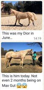 “I have not looked back since putting my horses on Max Gut Health. Especially in my sensitive, easily stressed horses I have noted the huge improvement in their coats, they have gained good weight and muscle which they are maintaining even in the busy months when travelling from Plett to Johannesburg/Shongweni for the bigger shows. Not only has their condition improved but their overall wellness and mental state has had a positive change, they are happier and easier on the ground and under saddle. MGH has been an integral part in making sure that my horses are feeling their best”